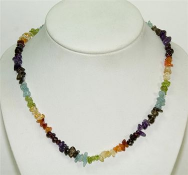 18" Chakra chip choker with lobster claw clasp and 1" chain.